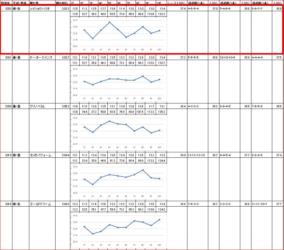 予想記事で書いた、【過去5年のラップ】と比較すると、3ハロン・5ハロンの通過がほぼ過去最遅。