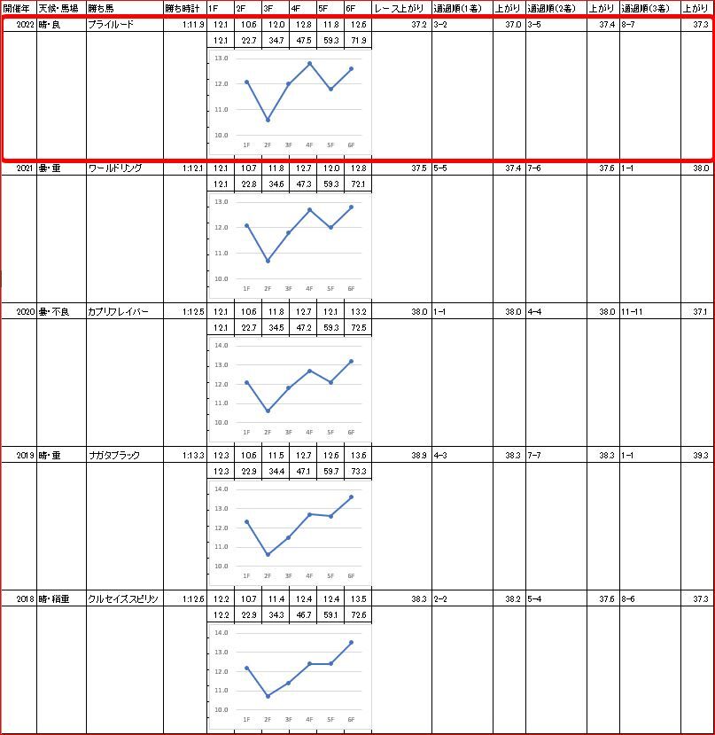 予想記事で書いた、【過去5年のラップ】と比較すると、3ハロンの通過が過去最遅。