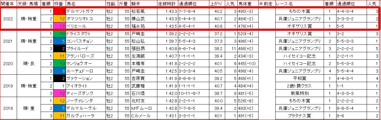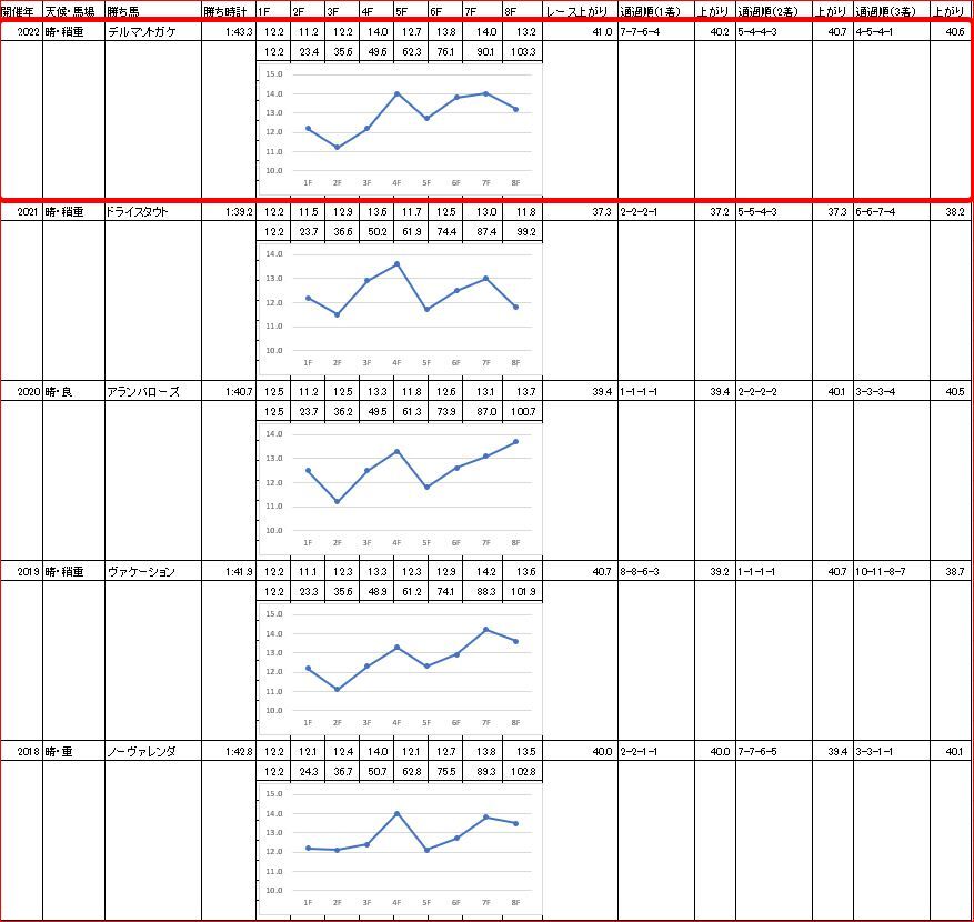 予想記事で書いた、【過去5年のラップ】と比較すると、3ハロンの通過が過去最速の一方、5ハロンの通過が過去最遅。