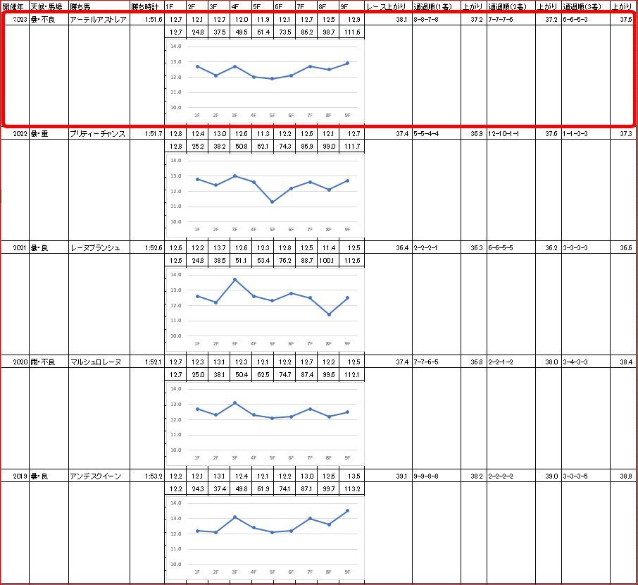 予想記事で書いた、【過去5年のラップ】と比較すると、3ハロン・5ハロンの通過が過去最速。
