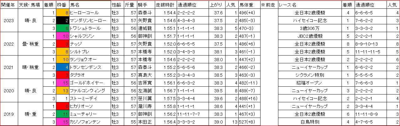 過去5年で馬券内に来た15頭中、4コーナーで4番手以内だった馬が13頭。