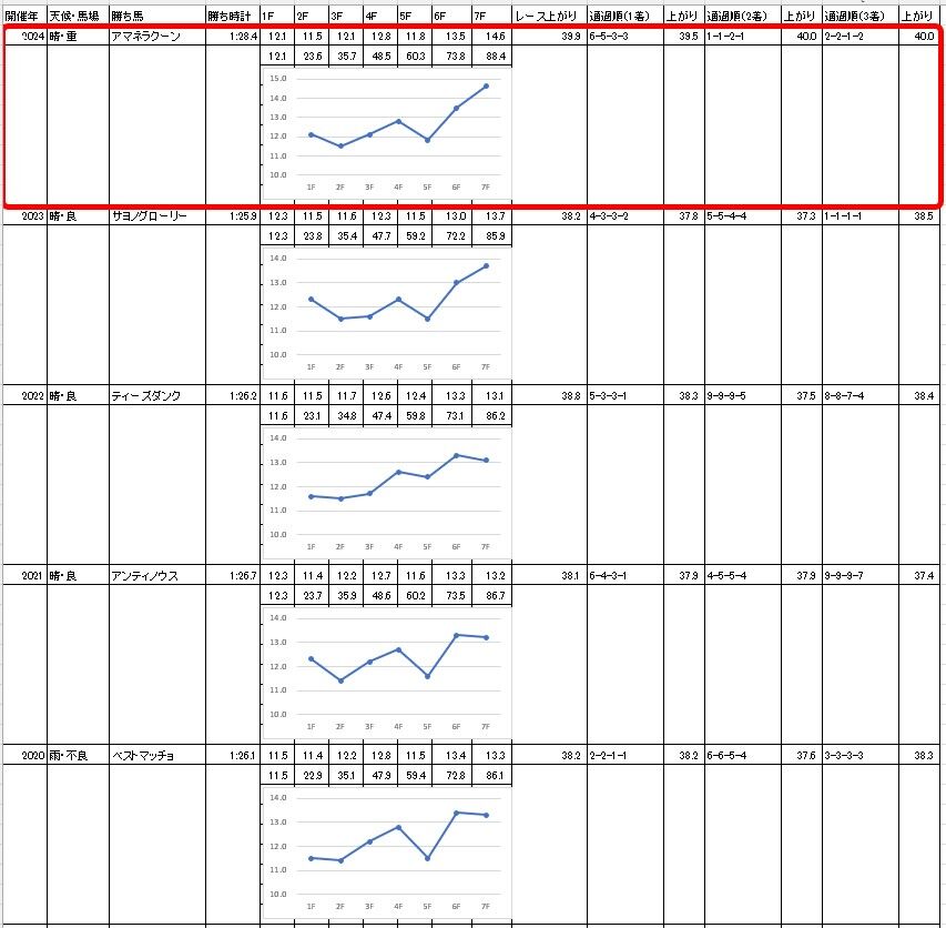 予想記事で書いた【過去5年のラップ】と比較すると、3ハロン・5ハロンの通過が過去最遅。