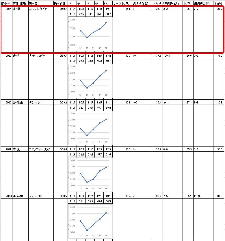 予想記事で書いた【過去5年のラップ】と比較すると、3ハロンの通過が過去最遅。