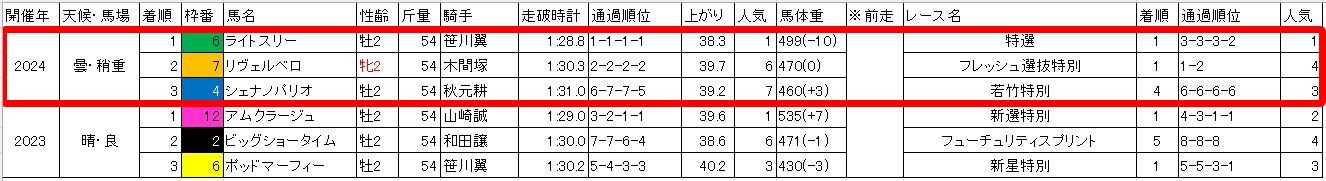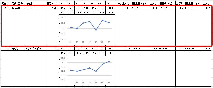 予想記事で書いた昨年のラップと比較すると、3ハロン・5ハロンの通過が昨年より1秒近く遅かった。