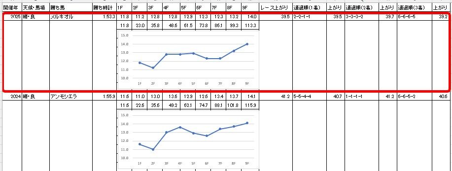 予想記事で書いた【過去のラップ】と比較すると、3ハロンの通過が昨年同様である一方、5ハロンの通過が昨年より早め。