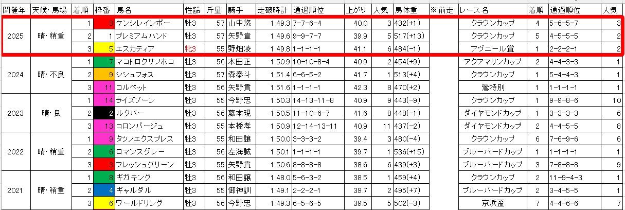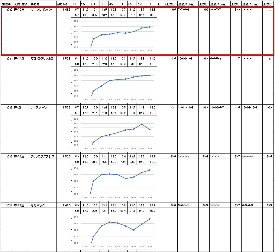 予想記事で書いた【過去5年のラップ】と比較すると、3.5ハロン・5.5ハロンの通過が例年並み~やや早め。