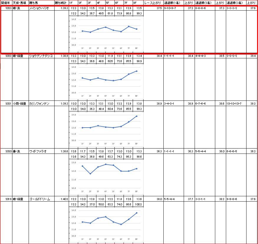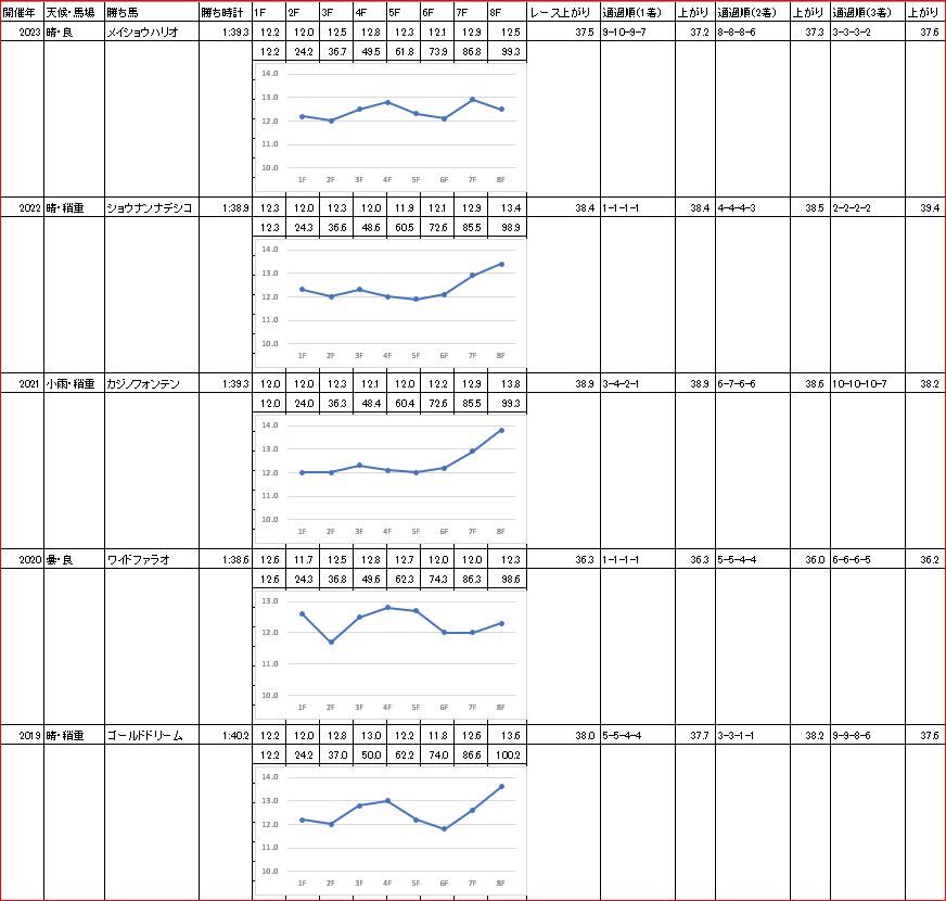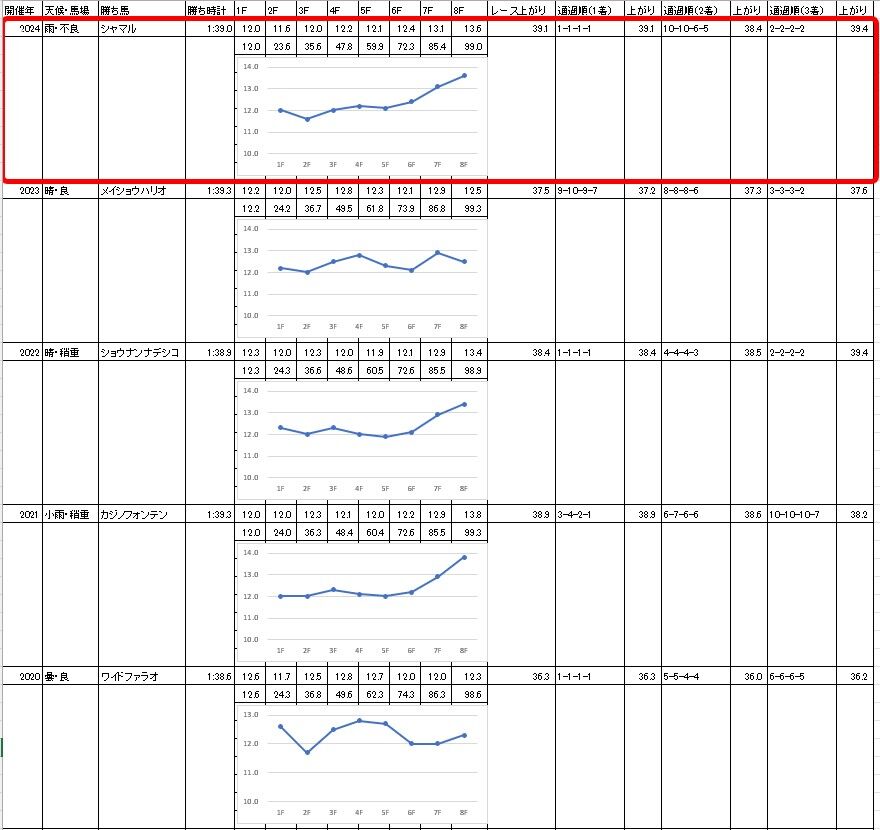予想記事で書いた【過去5年のラップ】と比較すると、3ハロン・5ハロンの通過が過去最遅。