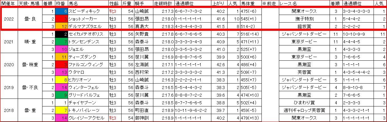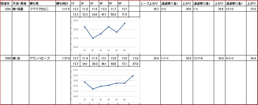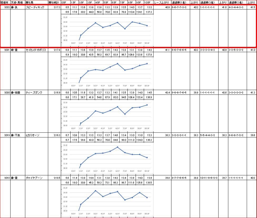 予想記事で書いた、【過去5年のラップ】と比較すると、3ハロン・5ハロンの通過が過去最遅。