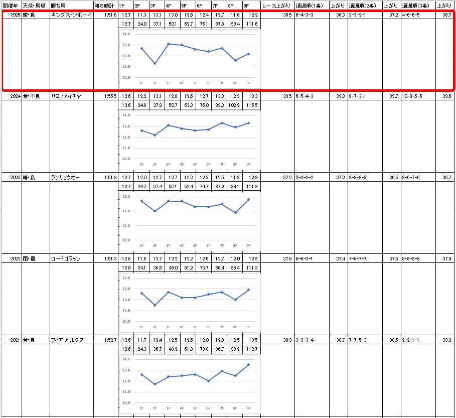 予想記事で書いた【過去5年のラップ】と比較すると、3ハロン・5ハロンの通過が例年並みかやや遅め。