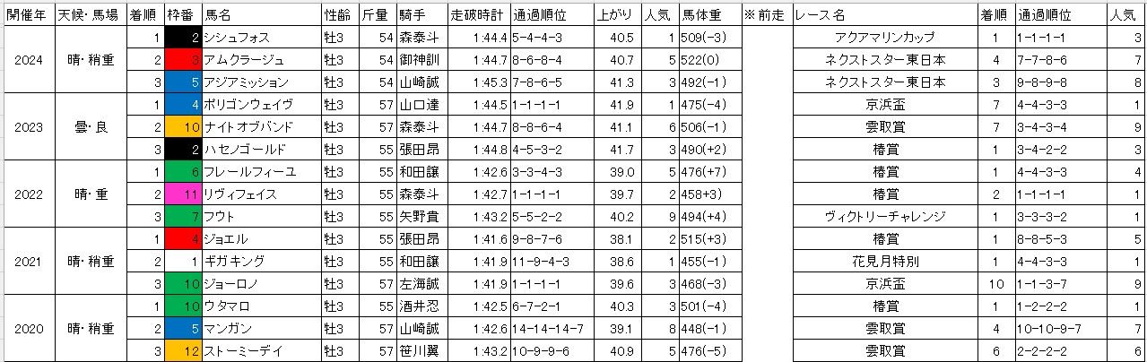 過去5年で馬券内に来た15頭中、4コーナーで4番手以内だった馬が10頭。