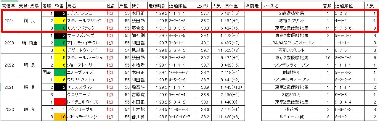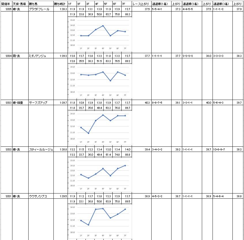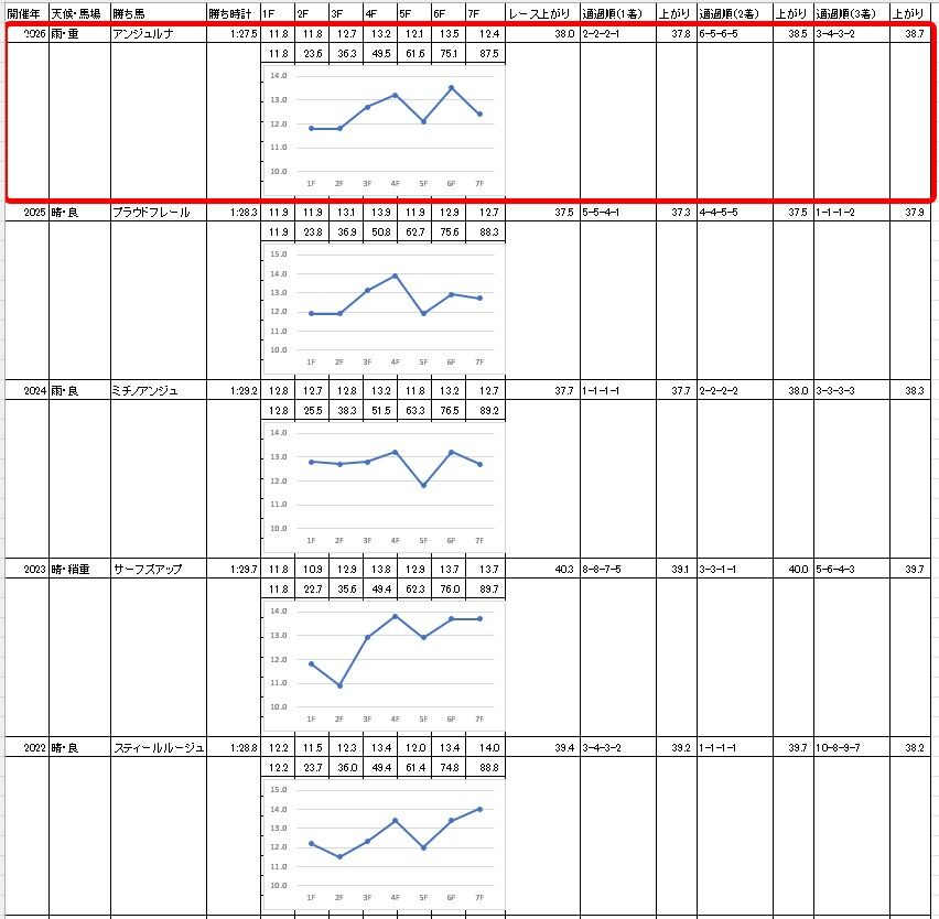 予想記事で書いた【過去5年のラップ】と比較すると、3ハロン・5ハロンの通過が例年並みか速め。