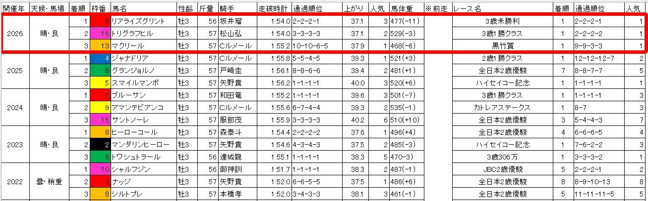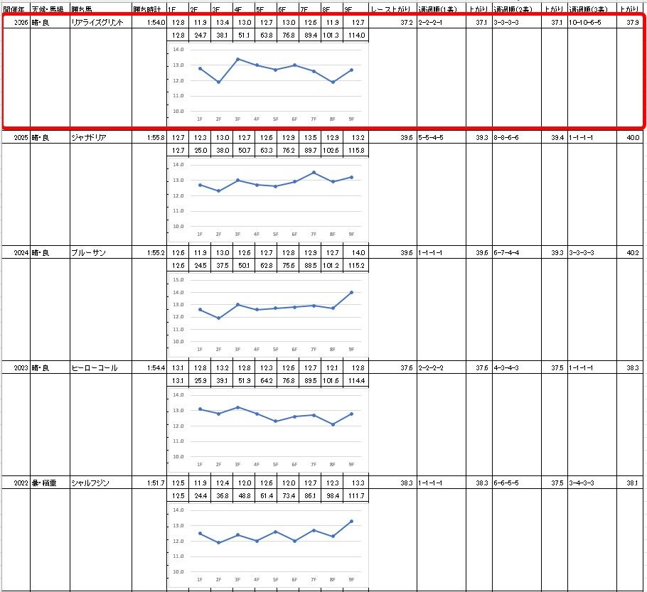 予想記事で書いた【過去5年のラップ】と比較すると、3ハロン・5ハロンの通過が例年並みか遅め。