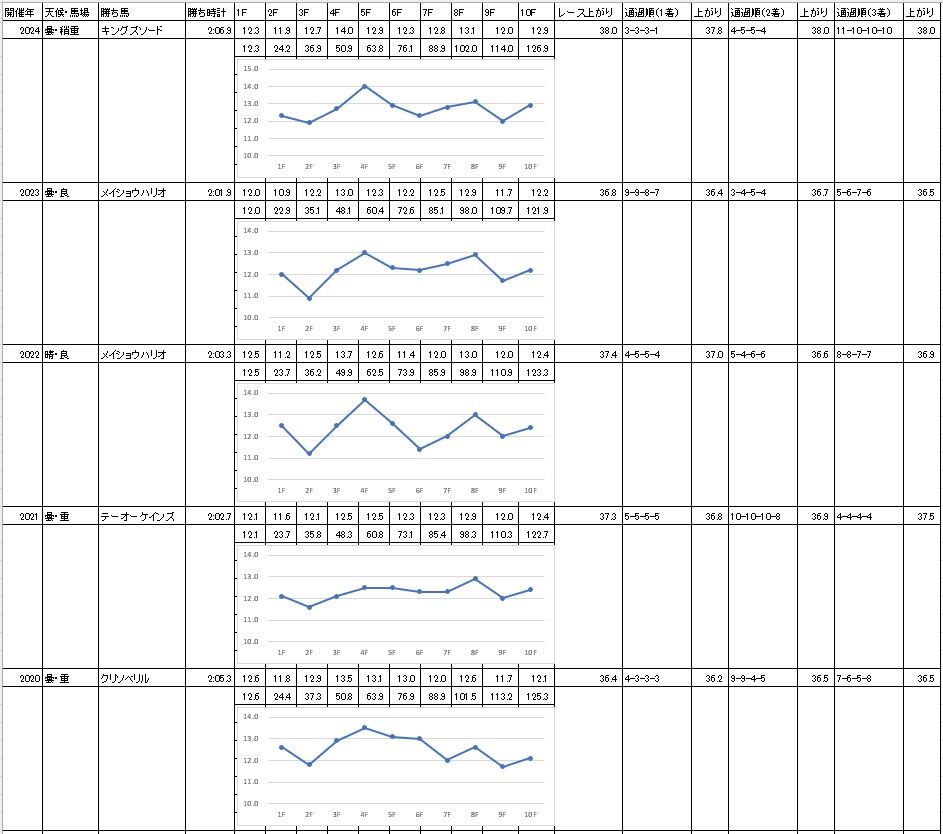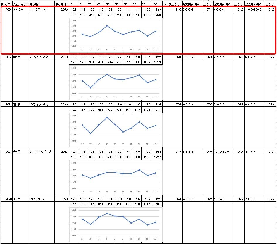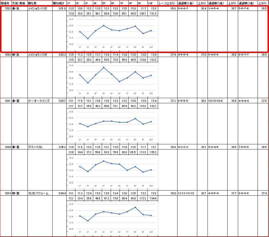 予想記事で書いた【過去5年のラップ】と比較すると、3ハロン・5ハロンの通過が早め。