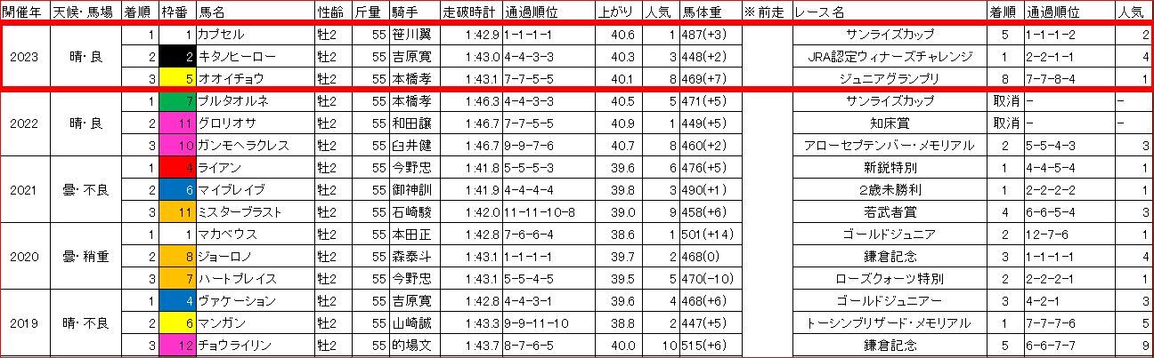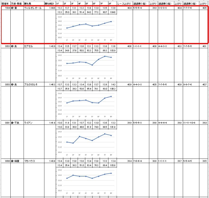 予想記事で書いた【過去5年のラップ】と比較すると、3ハロン・5ハロンの通過が平均的。