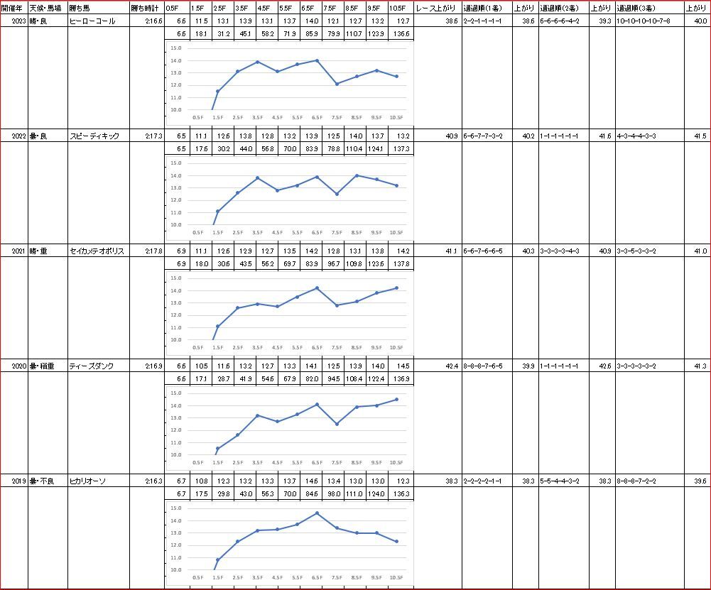 予想記事で書いた【過去5年のラップ】と比較すると、3.5ハロン・6.5ハロンの通過が例年並み。