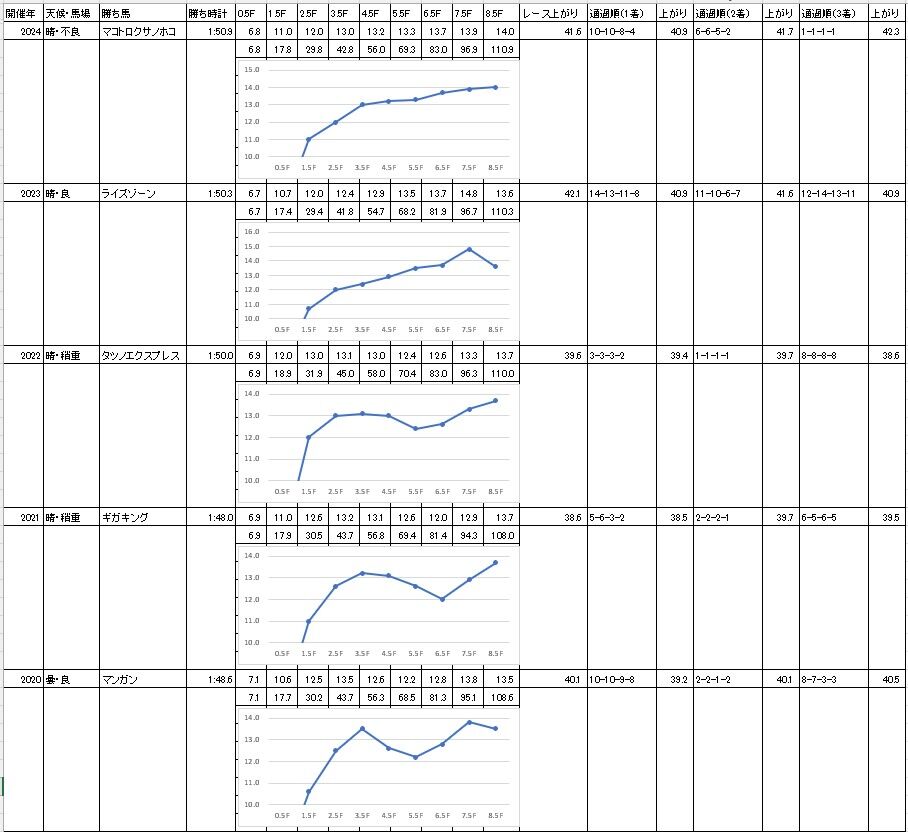 予想記事で書いた【過去5年のラップ】と比較すると、3.5ハロン・5.5ハロンの通過が例年並み~やや早め。